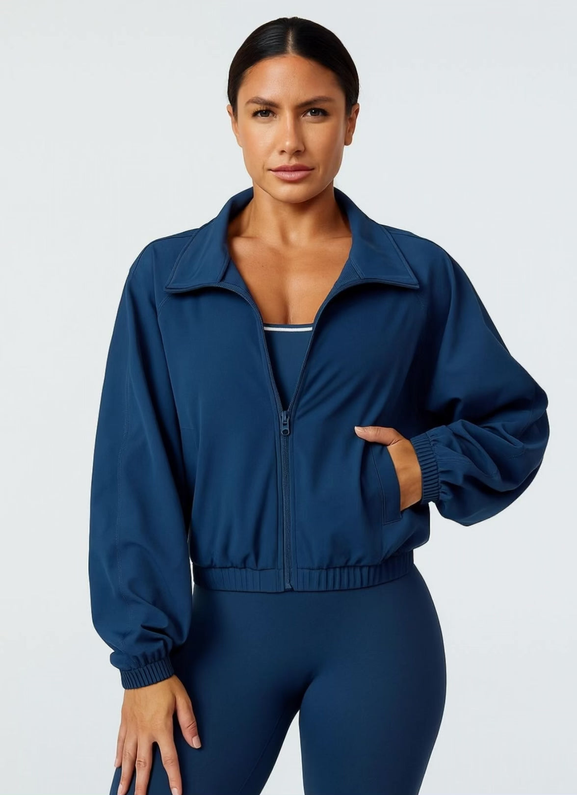 Esta chamarra fitness combina estilo deportivo y comodidad moderna. Está confeccionada en una tela ligera y elástica de secado rápido, ideal para entrenamientos o looks casuales.